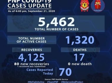 (Eagle News)–The Philippine National Police has reported 80 additional COVID-19 recoveries within its ranks. With the development, the PNP said the number of total recoveries rose to 4125 as of Monday night. One recovery, the PNP said, has been readmitted. Seventy additional COVID-19 cases pushed to total to 5462. Of these, the PNP said 1320 were active. No additional death was reported, which means the death toll remains at 17. The police are among the […]