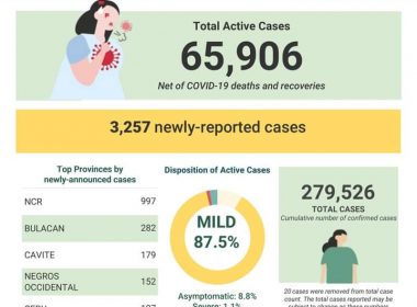 (Eagle News)–COVID-19 cases in the country are nearing the 280,000 mark after the Department of Health reported an additional 3257 cases on Friday, Sept. 18. The DOH said of the 279,526 total cases, 65906 were active. Of these, 87.5 percent were mild, 8.8 percent asymptomatic, 1.1. percent severe, and 2.6 percent critical. Of the 3257 newly-reported cases, 2628 or 81 percent occurred within the last 14 days. Metro Manila had the most number of newly-announced […]