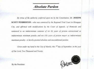 BuCor starts processing Pemberton release after DOJ transmits certificate of absolute pardon