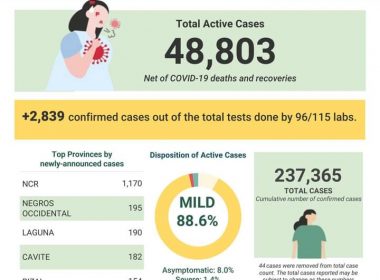(Eagle News)–COVID-19 cases in the country breached the 237,000 mark on Sunday, Sept. 6, after the Department of Health reported 2839 additional cases. The DOH said of the 237,365 total cases, 48803 were active. Of these, 88.6 percent were mild, 8 percent asymptomatic, 1.4 percent severe, and 2 percent critical. The 2839 additional cases were from results of tests done by 96 out of 115 labs. Of these, 1170 were from Metro Manila, 195 from […]