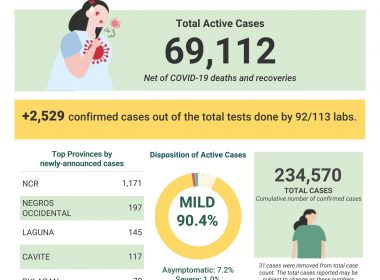 (Eagle News) — COVID-19 cases in the country breached the 234,000 mark on Saturday, Sept. 5, after the Department of Health reported an additional 2529 cases. The DOH said of the 234,570 total cases, 69,112 were active. Of these, 90.4 percent were mild, 7.2 percent asymptomatic, 1.0 percent severe, and 1.4 percent critical. The 2,529 additional cases were from tests done by 92 out of 113 labs. Of these, the DOH said 1171 were from […]