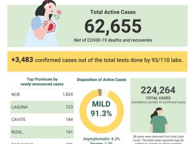 (Eagle News) — The number of COVID-19 cases in the country rose to 224,264 on Tuesday, Sept. 1, after the Department of Health reported 3483 additional cases. According to the DOH, of the total COVID-19 cases, 62,655 were active. Of these, 91.3 percent were mild, 6.3 percent asymptomatic, 1 percent severe, and 1.4 percent critical. The 3483 additional COVID-19 cases reported today were from results of tests done by 93 out of 110 labs. Of […]