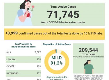 (Eagle News) — The number of COVID-19 cases in the country breached the 209,000 mark on Friday, Aug. 28, after the Department of Health reported 3,999 additional cases. According to the DOH, of the 209,544 total cases, 71745 were active, of which 91.2 percent were mild, 6.8 percent asymptomatic, 0.8 percent severe, and 1.2 percent critical. The DOH said the 3,999 additional cases were from results done by 101 out of 110 labs. Of these, […]
