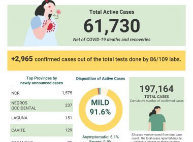 (Eagle News) — The number of coronavirus disease 2019 cases in the country breached the 197,000 mark after the Department of Health reported 2,965 additional cases on Tuesday, Aug. 25. The DOH said of the 197,164 total cases, 61,730 were active. Of these, 91.6 percent were mild, 6.1 percent asymptomatic, 0.9 percent severe, and 1.4 percent critical. The DOH said the 2,965 additional COVID-19 cases were from tests done by 86 out of 109 labs. […]