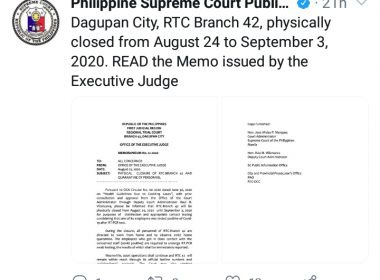 (Eagle News)–Branch 42 of the Dagupan City Regional Trial Court is physically closed until September 3. Memorandum 12-2020 from Executive Judge Caridad Galvez said the temporary closure, which started on Aug. 24 and was approved by the Supreme Court’s Office of the Court Administrator, was after an employee tested positive for COVID-19. The memo, which was uploaded on the SC Twitter account, said this was to allow for the disinfection of the premises and contact […]