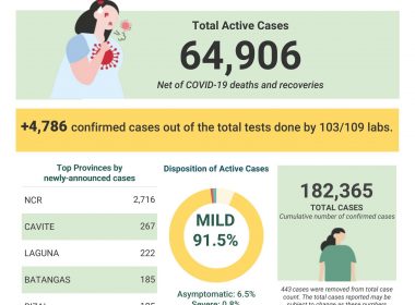 (Eagle News) — The number of coronavirus disease 2019 cases in the country breached the 182,000 mark on Friday, Aug. 21, after the Department of Health reported 4,786 additional cases. According to the DOH, of the total 182,365 cases, 64,906 were active. Of these, 91.5 percent were mild, 6.5 percent asymptomatic, 0.8 percent severe, and 1.2 percent critical. The DOH said the 4,786 newly-announced cases were from total tests done by 103 out of 109 […]
