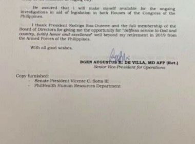 (Eagle News) — A high-ranking official of PhilHealth resigned on Thursday, Aug. 6. In a letter sent to PhilHealth Chief Ricardo Morales, a copy of which was also given to Senate President Tito Sotto, Augustus de Villa said he was tendering his “irrevocable resignation” as senior vice president for operations effective immediately but did not state the reason. De Villa, a retired general, said Morales “knows fully well the reasons” as he briefed him in […]