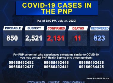 (Eagle News) — The number of coronavirus disease 2019 cases in the Philippine National Police has reached 2151. The PNP said of these confirmed cases as of Friday night, 823 have recovered. Eleven have died so far. Suspect cases are at 2521, while probable cases have reached 850. The Department of Health earlier said the guidelines for the time-based determination of whether or not mild and asymptomatic cases have recovered have been approved by the […]