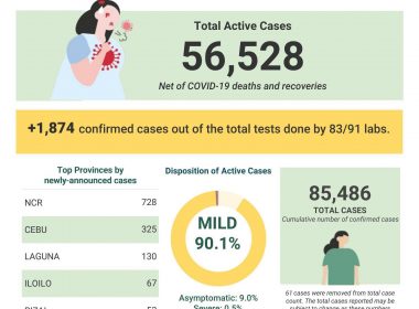 (Eagle News) — The number of coronavirus disease 2019 cases in the country breached the 85,000 mark on Wednesday, July 29, after the Department of Health reported 1874 cases on the same day. The DOH said of the 85486 total COVID-19 cases, 56528 were active cases. Of the active cases, 90.1 percent were mild, 9 percent asymptomatic, 0.5 percent severe, and 0.4 percent critical. The 1874 newly-announced COVID-19 cases were from tests done by 83 […]