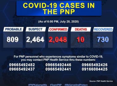 (Eagle News) — The number of coronavirus disease 2019 cases in the Philippine National Police has breached the 2000 mark. The PNP said as of today, 6 p.m., COVID-19 cases in their ranks have reached 2048. Ten deaths have so far been reported, while 730 have recovered. The PNP said suspected cases are at 2464. Probable cases have reached 809. Policemen in the country are frontliners amid the COVID-19 pandemic, as they continue to man […]