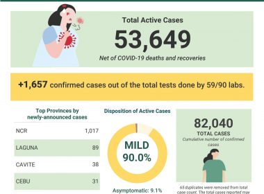 (Eagle News) — The number of COVID-19 cases in the country on Monday, July 27, breached the 82000 mark after the Department of Health reported 1657 cases on the same day. The DOH said of the 82,040 total cases, 53649 were active cases. Of this, 90 percent were mild, 9.1 percent asymptomatic, 0.5 percent severe, and 0.4 percent critical. Of the 1657 newly-announced cases from tests done by 59 out of 90 labs, the DOH […]
