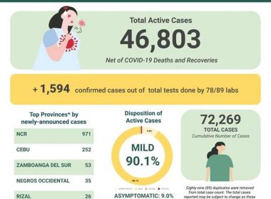 (Eagle News)–The number of coronavirus disease 2019 cases in the country breached the 72000 mark on Wednesday, July 22, after the Department of Health reported 1594 cases. The DOH said of the 72,269 total COVID-19 cases, 46,803 are active cases, of which 90.1 percent are mild, 9 percent asymptomatic, 0.5 percent severe, and 0.4 percent critical. The 1594 cases reported on Wednesday were from total tests done by 78 out of 89 labs. Of this […]