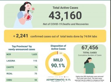 (Eagle News) –Total COVID-19 cases in the country reached 67,456 on Sunday, July 19 after 2,241 new cases were reported, mostly coming from Metro Manila, the Department of Health said. Metro Manila accounted for 1,625 of the new cases reported on Sunday. This was followed by Laguna with 115 new cases, Cavite with 76 new cases, Rizal with 75 new cases, and Cebu with 55 new cases. Active cases reached 43,160 as of Sunday, […]