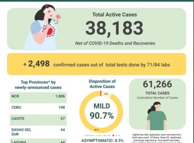 (Eagle News) — COVID-19 cases continued to surge nationwide with the addition of almost 2,500 cases just for today, Thursday, July 16, mostly coming from Metro Manila, as total cases reached 61,266. Total active cases, wherein recoveries and number of COVID-19 deaths have already been substracted, reached 38,183, most of them mild cases at 90.7 percent, but with increasing percentage of asymptomatics (those showing no symptoms) at 8.5 percent. Severe cases and critical cases accpunted […]