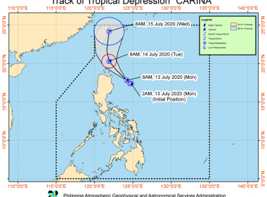 (Eagle News) — Signal No. 1 remains hoisted over Batanes and other areas as Tropical Depression “Carina” moves northwest towards extreme Northern Luzon. The Philippine Atmospheric Geophysical and Astronomical Services Administration said the same signal remains hoisted over Babuyan Islands, and the northeastern portion of mainland Cagayan (Santa Ana, Gonzaga, Santa Teresita, Buguey, eastern Lal-lo, eastern Gattaran, and eastern Baggao) with “Carina” located 245 kilometers east of Tuguegarao, moving northwestward at 15 kilometers per hour. […]