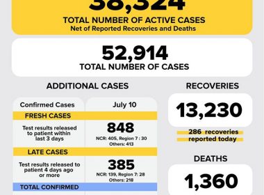DOH reports 286 recoveries, 42 deaths today (Eagle News) — The number of coronavirus disease 2019 cases in the country is nearing the 53000 mark after the Department of Health reported 1233 cases on Friday, July 10. The DOH said of the total 52914 COVID-19 cases, 38324 were active cases. Of the 1233 cases reported today, 848 were fresh cases, or cases where results were given to the patient within the last three days. The […]