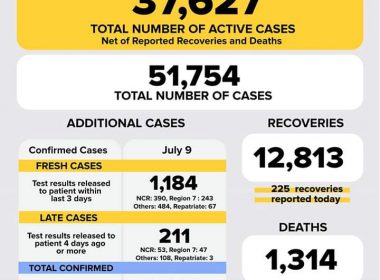 (Eagle News)–The number of coronavirus disease 2019 cases in the country has breached the 51,000 mark–now at 51754–after the Department of Health reported 1395 cases on Thursday. The DOH said no new deaths were reported, with the total retained at 1314. Of the 51754 COVID-19 cases, the DOH said 37627 are active cases. Of the total cases, 1184 were fresh cases, or cases where test results were reported to the patient within the last three […]