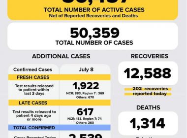 (Eagle News)–The number of coronavirus disease 2019 cases in the country has breached the 50,000 mark—with 50359 cases—after the Department of Health reported 2539 cases on Wednesday night. The DOH said of the 50,359 total cases, 36457 were active cases. Of the 2539, 1922 were fresh cases, or cases where test results were reported to the patients within the last three days. Over 600–or 617—were late cases, or cases where results to patients were released […]