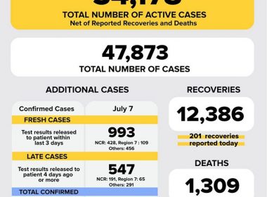 (Eagle News) — The number of coronavirus disease 2019 cases in the country has reached 47873 after the Department of Health reported 1540 cases on Tuesday, July 7. According to the DOH, of the 47873 cases, 34178 are active cases. Of the 1540 cases reported today, 993 were fresh cases, or cases where test results were released to the patient within three days. Over 500–or 547–were late cases, or cases where test results were released […]