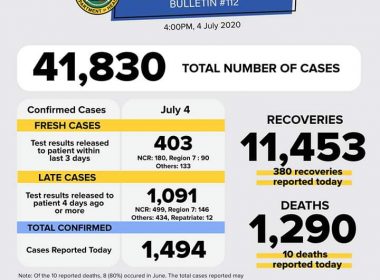 11453 recover, 1290 die (Eagle News)–The number of coronavirus disease 2019 cases in the country has reached 41830, with the Department of Health reporting 1494 cases on Saturday, July 4. Of the 1494, 403 were fresh cases, or cases where test results were given to the patient within the last three days. Over 1000, or 1091, were late cases, or cases where test results were released four days ago or more. Of the 403 fresh […]