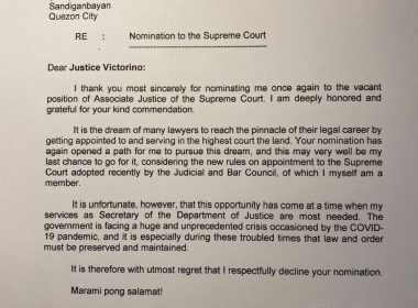 (Eagle News)–Justice Secretary Menardo Guevarra has been nominated to the post of Associate Justice of the Supreme Court. But Guevarra declined the nomination made by retired Sandiganbayan Associate Justice Raoul Victorino, even if he acknowledged “this may very well be my last chance to go for it considering the new rules on appointment to the Supreme Court adopted recently by the Judicial and Bar Council of which I myself am a member. He said it […]