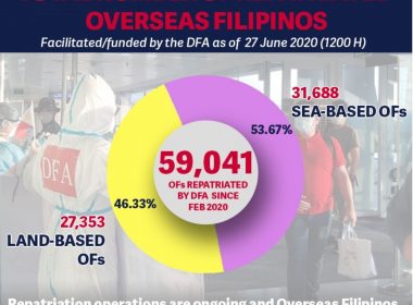 (Eagle News) –Over 59,000 overseas Filipinos have been repatriated to the country since February when the first flight from WUhan, China had brought home Filipinos from abroad, the Department of Foreign Affairs said. Last week alone, the DFA said it had repatriated almost 8,000 overseas Filipinos (OFs) or 7,928 OFs to be exact. This brought to 59,041 the total number of repatriated overseas Filipinos since the COVID-19 outbreak. Of the total, 53.67 percent (31,688) […]