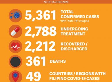 Number of COVID-19 cases among Filipinos overseas stands at 5361, DFA says (Eagle News)–The number of overseas Filipinos who recovered from the coronavirus disease 2019 has risen to 2212, the Department of Foreign Affairs reported. According to the DFA, the number of overseas Filipino COVID19 cases now stands at 5361, with the addition of six new cases in the Asia and the Pacific region, and Europe. The DFA said 361 deaths have so far been […]