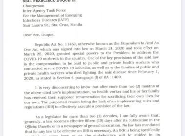 (Eagle News)–Senate President Tito Sotto on Wednesday, June 3, urged Health Secretary Francisco Duque III to grant compensation to health workers infected by the COVID-19 virus and to the families of those who died as stipulated in the Bayanihan To Heal As One Act. In asking Duque to implement section 4, paragraph I of Republic Act 11469 in a letter, Sotto noted “no health worker and his or her family has received their supposed remuneration […]