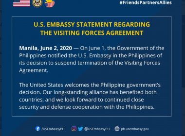(Eagle News) – The United States government said it welcomed the recent decision of the Philippine to suspend for six months the termination of the Visiting Forces Agreement (VFA). “On June 1, the Government of the Philippines notified the U.S. Embassy in the Philippines of its decision to suspend termination of the Visiting Forces Agreement,” the US Embassy statement said. “The United States welcomes the Philippine government’s decision. Our long-standing alliance has benefited both […]