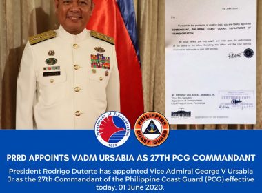 (Eagle News) — The Philippine Coast Guard has a new commandant. This was after President Rodrigo Duterte officially appointed Vice Admiral George V. Ursabia Jr. to the post left vacated by Admiral Joel Garcia, who retired on Monday, June 1. Ursabia is the 27th PCG commandant. His appointment is effective today. Earlier, the PCG said it had recommended three senior flag officers to Transportation Secretary Art Tugade, who would make the recommendation for the next PCG […]
