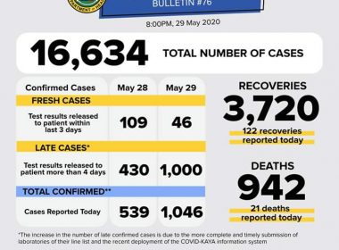 DOH says 46 are “fresh cases,” the rest are four days old or older (Eagle News)–The number of coronavirus disease 2019 cases in the country has breached the 16000 mark and is now at 16634 after the Department of Health reported on Friday night 1046 cases. The DOH, which had said it was ramping up tests to reduce an existing backlog, said of the 1046 reported cases, 46 were test results released to patients within […]