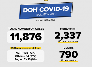 (Eagle News) — The number of coronavirus disease 2019 cases in the country has reached 11876, after the Department of Health reported 258 additional ones on Thursday, May 14. The DOH said of the new cases, 73 percent or 188 cases came from the National Capital Region, 21 percent or 54 cases from other areas, and 6 percent or 16 cases from Region 7. Eighty-six new recoveries were reported, bringing the total to 2337. […]