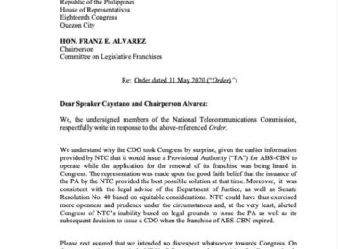 Says respect precisely for Congress prompted its decision (Eagle News) — The National Telecommunications Commission has defended its move to issue a cease and desist order against ABSCBN Corp., noting it was precisely its respect for Congress that prompted it to issue the same. In its letter to Speaker Alan Peter Cayetano and the House of Representatives’ committee on legislative franchises, the NTC noted that based on its months of study of legal arguments, the […]