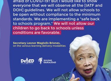 (Eagle News) – The Department of Education said that it would follow guidelines set by the Inter-Agency Task Force on Emerging Infectious Diseases (IATF-EID) and the Department of Health (DOH) once the new school year starts on August 24. Education Secretary Leonor Briones tried to assure parents of learners that they should not worry about this new school year as the DepEd and all schools will observe minimum standards set by the IATF for schools […]
