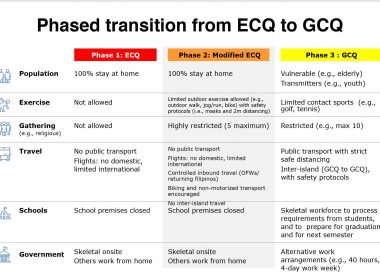 (Eagle News) – From enhanced community quarantine to a general community quarantine, the Philippines is following strict protocols for transition involving gradual phasing of allowed activities under the so-called “new normal.” Under the phasing or transitioning, there are four stages of community quarantine. From the extreme phase which is the enhanced community quarantine where there are lockdown protocols for high-COVID areas to a modified ECQ when cases start to decrease, to a General Community […]