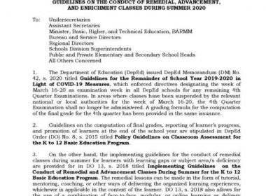 (Eagle News) – The Department of Education (DepEd) has issued guidelines on the conduct of summer classes for 2020, to take effect starting Monday, May 11. Under DepEd Memorandum No. 051 s. 2020, “distance learning modality” shall be utilized in the conduct of summer classes, in compliance with the government’s order to suspend physical classes during the quarantine period. “For Summer 2020, the conduct of remedial, enrichment, and advancement classes shall start on May 11, […]