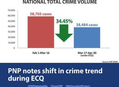 (Eagle News) – The country’s total crime volume dropped 34.45% during the enhanced community quarantine (ECQ) period, the Philippine National Police (PNP) reported on Thursday, May 7. In a statement, PNP Chief Archie Gamboa said the national total crime volume dropped “from 58,705 cases in the period February 1 to March 16, down to only 38,484 cases in March 17 to April 30 under ECQ.” Serious or index crimes – murder, homicide, physical injury, robbery, […]