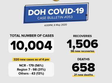 (Eagle News)– The number of coronavirus disease-2019 cases in the country has breached the 10,000 mark, with the addition of 320 cases on Wednesday, May 6 The Department of Health said of the total 10,004 cases, 1506 have so far recovered, including the 98 new ones. Twenty-one new deaths have been reported, bringing the total number of deaths to 658. According to the DOH, of the 320 new COVID-19 cases, 179 or 56 percent were […]