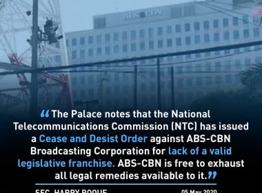 (Eagle News) – Broadcast network ABS-CBN is free to exhaust all legal remedies available, in view of the cease-and-desist order issued against it by the National Telecommunications Commission (NTC) due to the expiration of its franchise, Malacanang said on Tuesday, May 5. “The Palace notes that the National Telecommunications Commission (NTC) has issued a Cease and Desist Order against ABS-CBN Broadcasting Corporation for lack of a valid legislative franchise. ABS-CBN is free to exhaust all […]