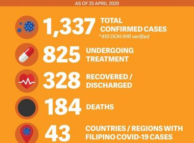 (Eagle News) – The Department of Foreign Affairs (DFA) reported 152 new COVID-19 cases involving overseas Filipinos, mostly from the Middle East, bringing the total number of confirmed cases to 1,337 as of Saturday, April 25. In a statement, the DFA said that for the past month, “an increasing trend of confirmed cases has been noted with an average of 37 cases per day, while there is a steady rate of recoveries and deaths at […]