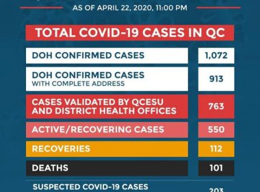 (Eagle News)–The Quezon City government has reported ten more COVID-19 cases, bringing the total to 1072. According to the local government, the number was based on Department of Health data. Of the figure, 763 have been validated by the Quezon City Epidemiology and Disease Surveillance Unit and district health offices so far. Batasan Hills still had the most cases, at 35. Batasan Hills also had the most deaths, at seven, followed by Tandang Sora at […]