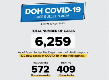 (Eagle News) — More patients are recovering from the coronavirus disease with the addition of 56 new recoveries as of Sunday, April 19, bringing the total to 572 as total confirmed cases rose to 6,259 because of widened mass testing, according to the Department of Health (DOH). The DOH reports 172 new confirmed cases as of 4 p.m., while only 12 new deaths were recorded bringing the total number of COVID-19 related fatalities to […]