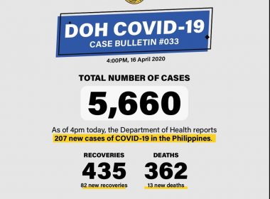 (Eagle News) — The Department of Health on Thursday, April 16, reported 82 more coronavirus disease 2019 recoveries, even as it reported an increase to 5660 in the COVID-19 cases in the country. In its 4 p.m. update, the DOH said the 82 additional recoveries brought the total to 435, more than the 362 COVID-19 deaths reported so far. The 362 deaths, the DOH said, includes the 13 recently added deaths. This is the second […]