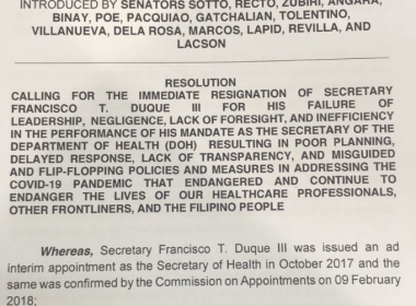 (Eagle News) — Several senators are calling for the resignation of Health Secretary Francisco Duque III as the country continues to fight the coronavirus disease 2019. The call for the resignation was contained in P.S. Resolution No. 362 signed by fourteen senators: Senate President Vicente Sotto III, Senate President Pro Tempore Ralph Recto, Senate Majority Leader Juan Miguel Zubiri, Senators Sonny Angara, Nancy Binay, Pia Cayetano, Grace Poe, Joel Villanueva, Francis Tolentino, Bong Revilla, Imee […]