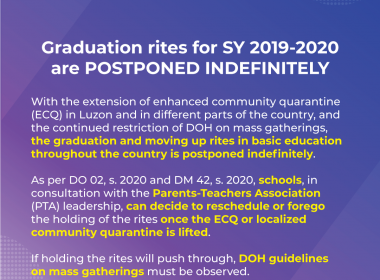 (Eagle News) – Graduation rites and moving up ceremonies for basic education for school year 2019-2020 were postponed indefinitely by the Department of Education (DepEd) in view of the extended enhanced community quarantine. “With the extension of enhanced community quarantine (ECQ) in Luzon and in different parts of the country, and the continued restriction of DOH on mass gatherings, the graduation and moving up rites in basic education throughout the country is postponed indefinitely”, […]