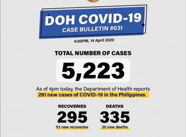 (Eagle News) — The number of coronavirus disease 2019 cases in the country has breached the 5000 mark, after the Department of Health reported 291 new cases on Tuesday, April 14. According to the DOH, of the 5223 COVID-19 cases overall, 295 recovered, counting the additional 53 recoveries. Twenty new deaths have been recorded, bringing that total to 335. Congress has approved P275 billion to fund the government’s COVID-19 response bid. The amount is expected […]