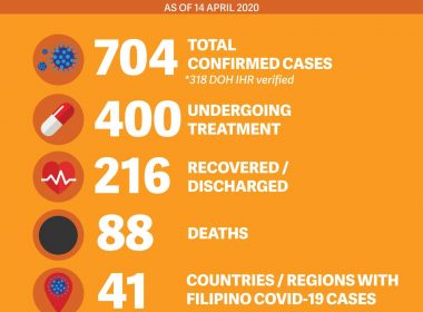 (Eagle News)- The Department of Foreign Affairs (DFA) on Tuesday, April 14, reported a 31.6% increase in the number of confirmed COVID-19 cases involving Filipinos overseas. In a statement, the DFA said that 44 new cases, 22 new recoveries, and 4 additional deaths were recorded as of today, April 14, involving overseas Filipinos in 41 countries/regions. The total number of confirmed cases stands at 704, with 216 recoveries and 88 deaths across 41 countries and […]