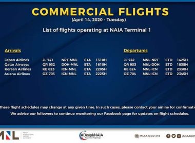 (Eagle News)–The Manila International Airport Authority has released its list of operational commercial flights. MIAA said the list was for Tuesday, April 14: Flight schedules may be subject to changes anytime. All flights are now concentrated in the Ninoy Aquino International Airport Terminal 1 in a bid to reduce the risk of exposure of airport workers to the coronavirus disease 2019, MIAA said earlier. The Philippines has so far confirmed over 4000 COVID-19 cases.