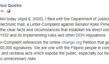 (Eagle News) — A lawyer has filed a complaint against Senator Koko Pimentel for his alleged breach of his self-quarantine for the coronavirus disease 2019, for which he later tested positive. In a Facebook post, lawyer Rico Quicho said he filed the complaint before the Department of Justice through electronic email against Pimentel for violation of Republic Act No. 11332, its implementing rules and regulations, and other Department of Health guidelines. RA No. 11332 bans […]