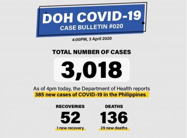 (Eagle News) – The number of COVID-19 cases in the country has climbed to 3,018 with the addition of 385 new cases, the Department of Health said on Friday, April 3, 2020. The coronavirus-related fatalities also rose to 136 as 29 new deaths were reported. Meanwhile, there was only one reported patient recovery in the past day, bringing the total recoveries to 52. The rise in COVID-19 patients was only expected according to the […]